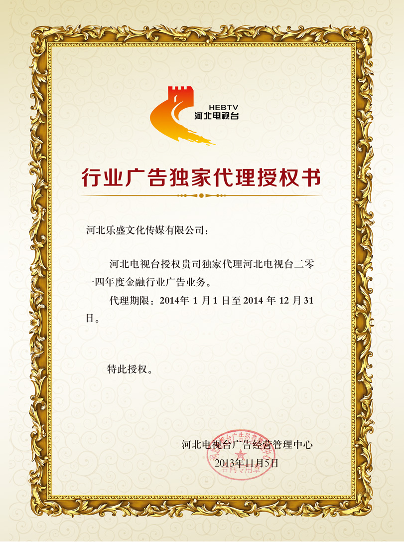 2013年11月5日,凭借专业、优秀的代理能力以及强大的客户开发能力,河北乐盛文化传媒有限公司再次受到河北电视台的亲睐获得河北电视台7个频道2014年的独家金融行业代理资格。