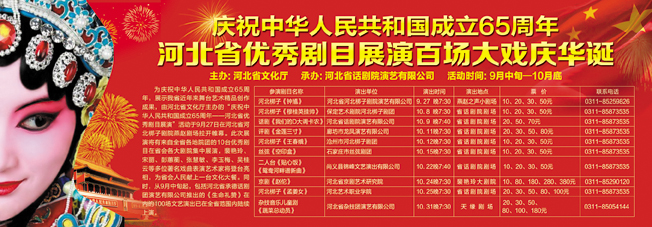 为庆祝中华人民共和国成立65周年,展示我省近年来舞台艺术精品创作成果,由河北省文化厅主办的“庆祝中华人民共和国成立65周年——河北省优秀剧目展演”活动于9月27日在河北省河北梆子剧院燕赵剧场拉开帷幕。此次展演将有来自全省各地院团的10台优秀剧目在省会各大剧院集中展演,裴艳玲、宋丽、彭蕙蘅、张慧敏、李玉梅、吴桂云等多位著名戏曲表演艺术家将登台亮相,为省会人民献上一台文化大餐。同时,从9月中旬起,包括河北省承德话剧团演艺有限公司推出的《生命礼赞》在内的100场文艺演出已在全省范围内陆续上演。