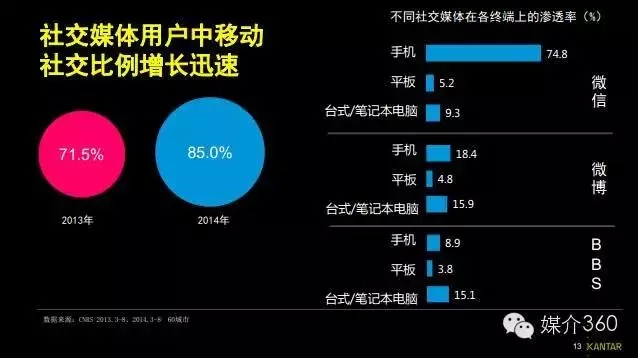 以下,综合了凯度发布的《2015中国社交媒体发展报告》、腾讯企鹅智库发布的《2015年微信平台数据研究报告》和新浪发布的《2014年微博用户发展报告》,为大家描绘出2015年社交媒体发展的大致轮廓。