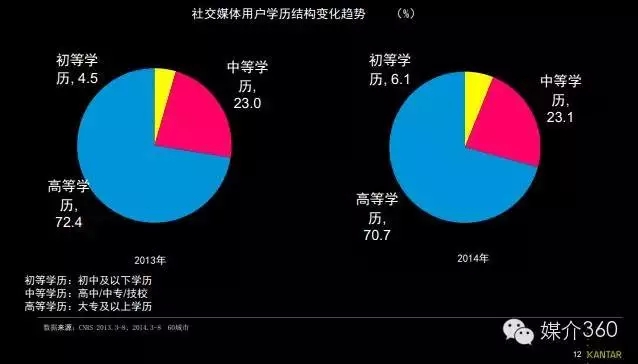 社交媒体用户受教育水平呈现多元化:高等学历比例小幅下滑,初等学历比例上升。