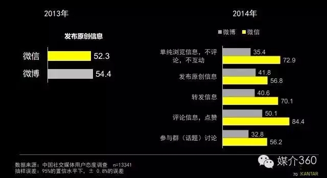2013年微博在原创方面占据优势,2014年则是微信全面领先。