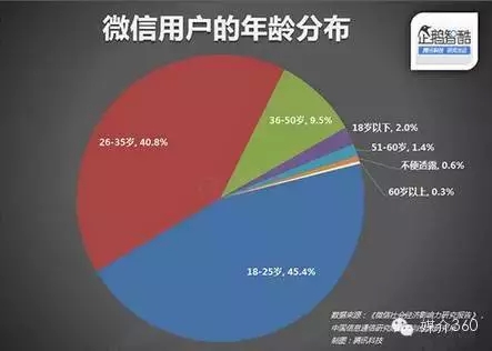 微信用户普遍年轻,平均年龄在26岁。97.7% 的用户在50岁以下。86.2%的用户在18-36岁。