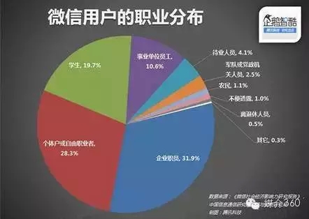绝大部分微信用户的职业来自:企业职员、自由职业者、学生、事业单位员工这四类职业。