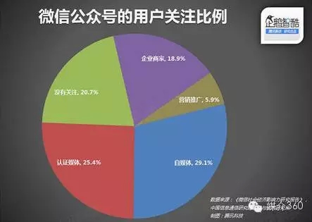 微信公众号的用户关注比例:29.1%自媒体;25.4%认证媒体;20.7%没有关注;18.9%企业商家;5.9%营销推广。