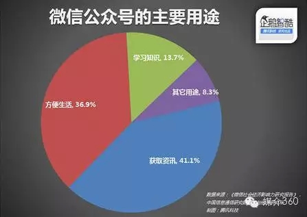 用户关注公众号主要目的是获取资讯41.1%,其实是方便生活36.9%和学习知识13.7%。