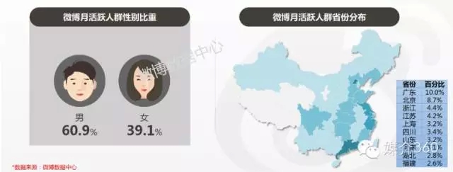 微博月活跃用户群中,男性用户占比较大,达60.9%,女性用户占39.1%。