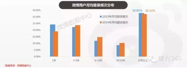 低粘度用户占比比重大幅降低:登陆一日的用户占比大幅下降,微博用户整体粘性依然保持较好的上涨态势。