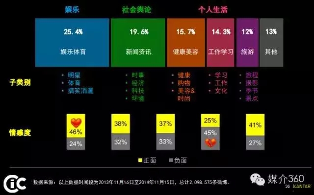根据《2015中国社交媒体影响报告》,网民在微博上除了热衷于讨论娱乐和社会舆论类资讯,还注重个人生活类信息的获取和互动。