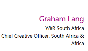 Graham Lang 作为南非获奖最多的的创意人之一,赢得了业内所有传统和非传统的类别中的重要奖项。并且他也成为许多区域性和国际性评审团成员。Graham Lang 在The Jupiter Drawing Room(南非知名广告公司)开普敦开始了他的职业生涯。在The Jupiter Drawing Room,他赢得了一大堆地区性的和国际性的奖项, 包括该国在黄铅笔奖(D&AD)的第一个银铅笔,他也是黄铅笔奖(D&AD)的第一个的南非评审。2003年,Graham Lang之后接到电话迁任至盛世长城伦敦(Saatchi & Saatchi London),在那里他又继续开展了地区性和国际性的获奖广告运动。2008年,在伦敦Graham Lang加入rkcr /扬罗必凯任全球整合创意总监。2011年,Graham Lang被调回南非,担任扬罗必凯首席创意官。